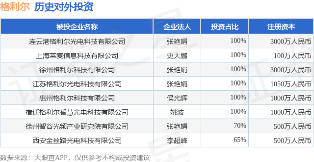 本站消息,根据天眼查APP显示华泰国际,格利尔(920641.BJ)新增一起对外投资事件,被投资公司为连云港格利尔光电科技有限公司,法定代表人张艳娟,投资占比为100%。该公司从事科技推广和应用服务业,注册资本为3000万人民币。目前,格利尔共存在对外投资8项,详见下表: