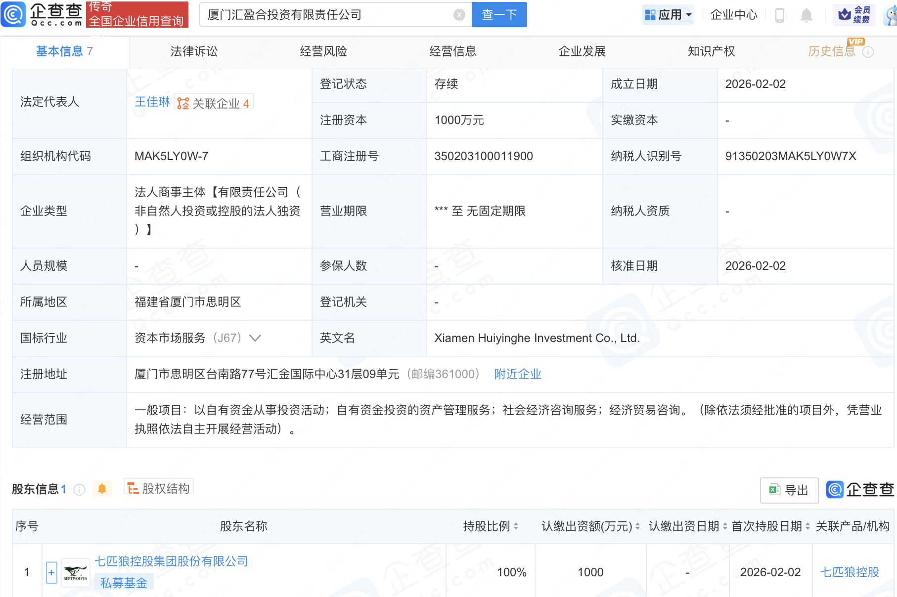 近日,厦门汇盈合投资有限责任公司、厦门汇骏达投资有限责任公司成立,注册资本均为1000万元,经营范围均包含:以自有资金从事投资活动;自有资金投资的资产管理服务;社会经济咨询服务;经济贸易咨询。企查查股权穿透显示,二者皆由七匹狼控股集团股份有限公司全资持股。