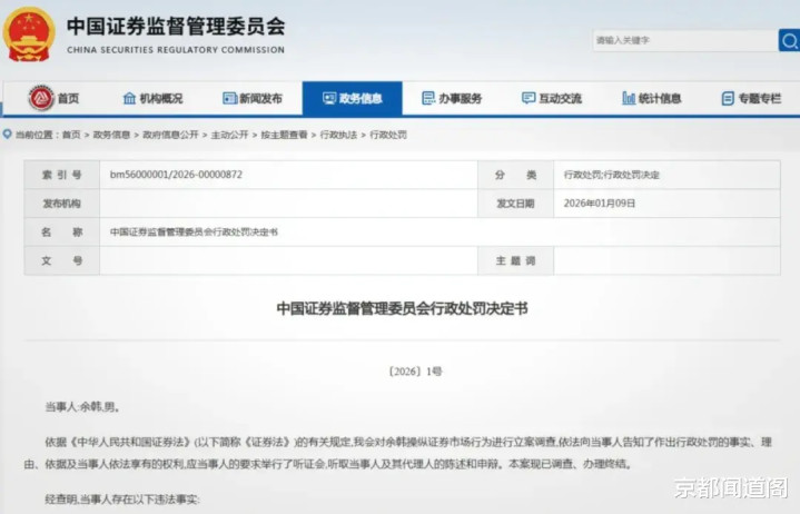 2026年伊始,编号为〔2026〕1号的行政处罚决定书如惊雷落地,震动资本市场。当事人余韩因操纵“博士眼镜”股价,被证监会处以“没一罚一”的顶格惩处——没收违法所得5.11亿元,并处以5.11亿元罚款,合计超10亿元。这不仅是巨额的经济惩戒,更是一份态度鲜明的宣言:资本市场“零容忍”的底线,不容触碰;谁敢以身试法,必将付出倾家荡产的代价。